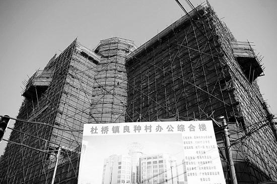 說它是熱帖,準(zhǔn)確地說其實(shí)就是一組照片。照片中,一幢大樓拔地而起,主體框架已搭建完畢,不過由于尚未完工,整幢大樓像是穿上了一層漁網(wǎng)服。大樓底下立著一塊規(guī)劃牌,最上面寫著“杜橋鎮(zhèn)良種村辦公綜合樓”,中間是大樓的效果圖,9層高的大樓看上去頗為壯觀。