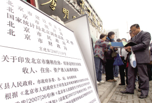 根據(jù)新頒布的城八區(qū)經(jīng)適房、廉租房審核標準,街道是申請者要過的第一關(guān)。昨天一大早,東直門街道就接待了50多名申請者,“我們一開門,‘轟’一下子擠進一堆人!苯值拦ぷ魅藛T告訴記者,當天他們共接待了200多位經(jīng)適房申請者。