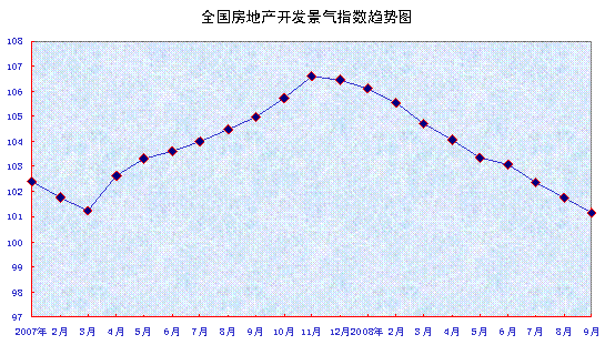 中新網10月21日電 據國家統(tǒng)計局網站數據顯示,9月份“國房景氣指數”為101.15,比8月份回落0.63點,比去年同月回落3.84點。