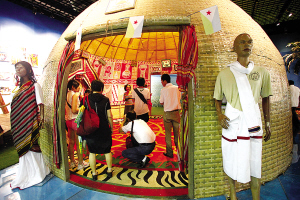 外墻頂部覆蓋著手編織帶,兩壁腰墻和地面分飾有手編掛毯和地毯,內墻上掛有圖案抽象的繪畫和手工藝品,小小民居包羅萬象——一走進非洲聯(lián)合館內的吉布提館,就能見一座蝸形民居“浮于水上”。這是吉布提游牧民族阿法爾人的傳統(tǒng)民居,叫“達布瓦塔”。上海世博會上的這個72平方米大小的達布瓦塔,全系在吉布提國內造好再裝進集裝箱漂洋過海而來,所以俱是原汁原味的吉布提當?shù)仫L情。