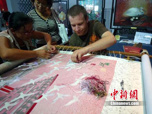 中新網(wǎng)上海7月20日電(肖前輝 劉吉科)入駐上海世博園寶鋼大舞臺(tái)“中國元素活動(dòng)區(qū)”傳習(xí)區(qū)表演半個(gè)月以來,湘繡以其神奇的針法和快樂的參與性受到世博游客的熱捧。截至7月20日,已有來自世界各地的上千名觀眾參與了刺繡。