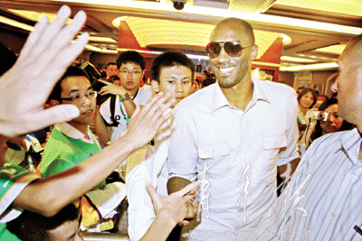 船艙里,穿著科比球衣的志愿者望眼欲穿。志愿者孫濤身上的科比8號球衣昭示著他鐵桿球迷的身份。“我喜歡他11年了!”還沒等記者發(fā)問,他便急不可耐地向記者介紹起自己身上地裝備。除了身上那件05版球衣,他還從包里小心翼翼地掏出一件連標簽還沒來得及撕掉的24號球衣,“24代表了超越喬丹的愿望,23+1嘛!边@個時候,眼里還是滿是即將見到偶像的興奮和激動。