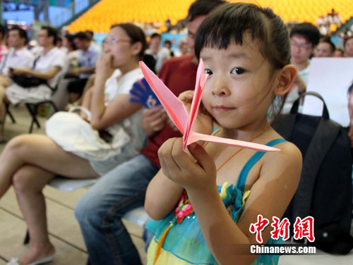 而經(jīng)典紅歌音樂會現(xiàn)場的近千名世博游客也紛紛親手折制紙鶴,將其一一放到舞臺上為舟曲人民祈福,整場音樂會充滿溫馨與感動。