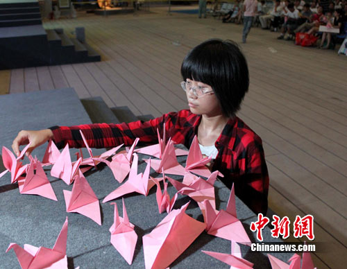 14日晚,在中國元素活動區(qū)里舉行的“中國元素民歌賞析會暨高暢經(jīng)典紅歌音樂會”上,主唱高暢和前來觀看演出的千名游客同折千只紙鶴為舟曲祈福。