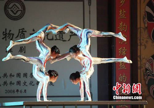 中新網(wǎng)鹽城8月19日電 (于從文 唐錚)8月18日晚,江蘇鹽城水街漂城戲苑張燈結(jié)彩,鑼鼓喧天,國(guó)家非物質(zhì)文化遺產(chǎn)淮劇、雜技在此向參加世博會(huì)“鹽城友誼日”活動(dòng)的外賓獻(xiàn)演,美輪美奐的表演博得外賓們的陣陣掌聲。