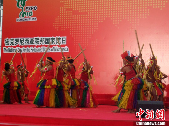 中新社上海8月29日電 (記者 鄭瑩瑩)以熱帶風(fēng)情著稱的太平洋島國密克羅尼西亞29日迎來國家館日。在官方儀式上,數(shù)十名島國舞者穿著及踝草裙,手持竹竿相互敲打,以原生態(tài)歌舞展現(xiàn)島國熱情奔放的民俗風(fēng)情。