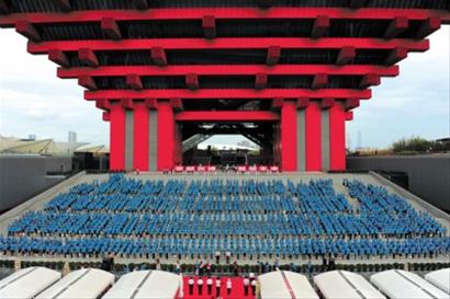 世博園內(nèi),“小白菜”們夾道歡迎老師們?nèi)雸;中國館前,2010名老師莊嚴(yán)宣誓,并共同唱響《教師之歌》。昨天是第26個(gè)教師節(jié),“奉獻(xiàn)世博·奠基未來”——2010年上海市慶祝教師節(jié)主題系列活動(dòng)之宣誓儀式在中國館南廣場舉行。市委副書記殷一璀出席儀式并致辭,副市長沈曉明出席。