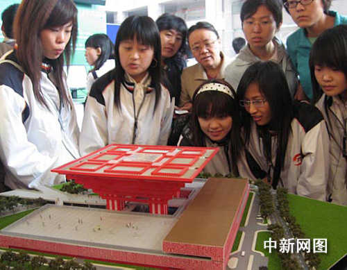 二0一0年上海世博會(huì)中國(guó)國(guó)家館外觀“東方之冠”的模型前,來(lái)自石家莊鐵道學(xué)院的大學(xué)生們對(duì)這個(gè)類似中國(guó)古代官帽的建筑興趣頗濃。