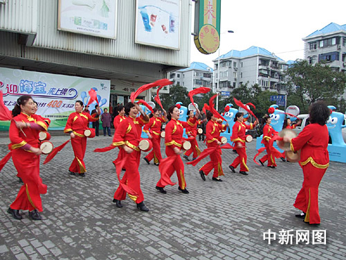 在長(zhǎng)青路、成山路口的華聯(lián)吉買盛廣場(chǎng)四周,23個(gè)2米高1米寬笑容可掬的海寶圍著一圈,不斷地向前來參加活動(dòng)的志愿者招手致意。一旁,喜慶的龍車上,鑼鼓敲得震天響。廣場(chǎng)中央,來自居民區(qū)的志愿者代表和來自社區(qū)學(xué)校的紅領(lǐng)巾代表集結(jié)在一起,他們將迎接海寶到小區(qū)。