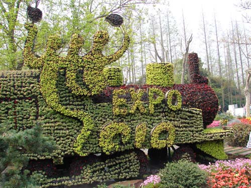 4月8日,綠色植物打造的“海寶”、“世博火車頭”,竹子、藤條編織出的城市文明志愿者——小螞蟻“小志”,還有在鮮花掩映下的“中國館”……這些濃郁的世博元素為近日的上;ㄕ乖鎏砹瞬簧倭辽。