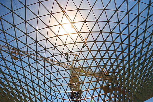 中新網(wǎng)4月30日電 據(jù)上海世博會官方網(wǎng)站消息,今天,世博軸上首批兩個喇叭狀的陽光谷正式落成,同時頂棚膜結構張拉啟動,這標志著世博軸上部主體工程即將全面完工。上海世博會執(zhí)委會專職副主任鐘燕群、上海世博局副局長丁浩等出席儀式。鐘燕群宣布啟動世博軸頂棚膜結構張拉。