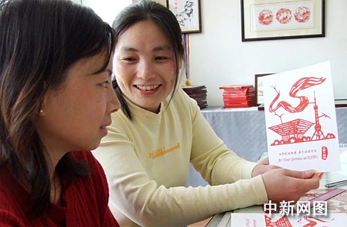 中新網(wǎng)上海5月1日電(舒祖康 鄭瑩瑩)一個(gè)線條流暢的志愿者標(biāo)志圖形——“中國(guó)心”飄在中國(guó)館的上空,這是浦東上鋼世博社區(qū)剪紙坊的師生們?yōu)樯虾J啦⿻?huì)倒計(jì)時(shí)一周年設(shè)計(jì)的剪紙圖案。