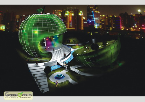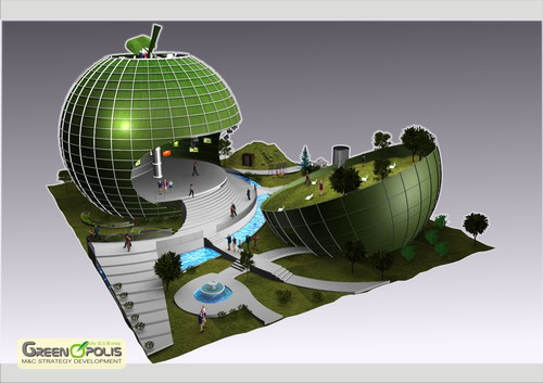 羅馬尼亞國(guó)家館的蘋果外形和標(biāo)志文字“GREENOPOLIS”體現(xiàn)了健康生活方式的重要性、對(duì)可持續(xù)發(fā)展理念的關(guān)注以及針對(duì)現(xiàn)代社會(huì)普遍存在問(wèn)題的以知識(shí)為本的解決方案。