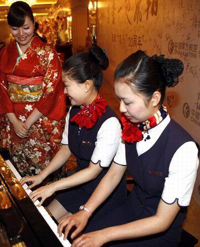 慶典儀式通過圖片展和影像資料展示了從1989年至今的20年里的“凌燕”2光輝歷程。現(xiàn)場數(shù)十名“凌燕”機(jī)組人員通過調(diào)酒、烹飪、手語、太極等表演形式展現(xiàn)了“凌燕”組員多才多藝和“至尊、至誠、至精、至美”的服務(wù)理念。