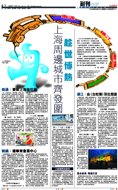 香港文匯報(bào)報(bào)道稱,世博會(huì)是全國盛事,而上海周邊“近水樓臺(tái)”的南通、鎮(zhèn)江及無錫等鄰近城市,都想借世博會(huì),把各自的旅游和商貿(mào)經(jīng)濟(jì)效益推至高峰。最近,它們便剛完成很多配套項(xiàng)目。