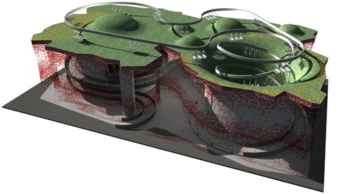據(jù)了解,瑞士館主體結(jié)構(gòu)由兩個承重的大小圓柱和綠草如茵的屋頂組成,館內(nèi)底層展廳營造的都市空間和館頂?shù)淖匀豢臻g相互呼應,觀光纜車帶領(lǐng)參觀者往返其間,給人以身臨其境,在城市和鄉(xiāng)村之間優(yōu)游的美好感受。瑞士館另一大亮點是其互動閃光的帷幕外墻,將由半透明的鋁網(wǎng)結(jié)構(gòu)帷幕覆蓋,11000塊包含敏化太陽電池的的生物樹脂懸掛其上,與展館周圍的能量如陽光和相機的閃光發(fā)生反應,整個外墻呈現(xiàn)一種動態(tài)閃光的視覺效果,以此展示能源的利用。