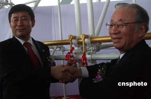 7月4日,上海世博會(huì)日本產(chǎn)業(yè)館在“中國第一廠”江南造船廠的舊址內(nèi)“豪華”奠基。該產(chǎn)業(yè)館是日本民間企業(yè)第一次如此大規(guī)模地聯(lián)手參展本國以外的世博會(huì)。上海世博會(huì)事務(wù)協(xié)調(diào)局局長洪浩與日本產(chǎn)業(yè)館參展合同公司代表堺屋太一共同啟用將用于展館建設(shè)的金色螺母,攜手見證奠基。中新社發(fā) 鄭瑩瑩 攝