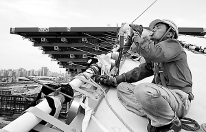 下午兩點(diǎn),記者帶著溫度計(jì)來到世博工地外國館片區(qū),陽光下,水銀柱停留在40攝氏度上。走上5分鐘,汗水濕透了全身。高溫挑戰(zhàn)著每個(gè)建設(shè)者的意志力。在法國館將要完成的鋼結(jié)構(gòu)屋頂上,幾個(gè)工人正在安裝最后的鋼架,為了避免曬傷,他們穿著長(zhǎng)袖長(zhǎng)褲的工作服,戴著安全帽。從屋頂爬下來時(shí),每個(gè)人都像是剛從水里撈上來的。工人老張說,安全帽不能脫,汗水一刻不停地沿著帽子流下來,眼睛都睜不開,得一直用手擦。