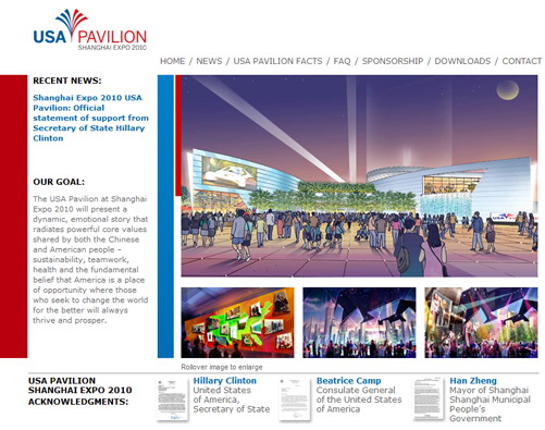 通過(guò)“最新動(dòng)態(tài)”,網(wǎng)友可以清晰、直觀地了解美國(guó)館每一步的籌備動(dòng)態(tài);而在“美國(guó)館概況”欄目中,網(wǎng)站全面介紹了美國(guó)館的理念、組織方及參展目標(biāo)等。此外,該網(wǎng)站還特別刊登了美國(guó)國(guó)務(wù)卿希拉里•克林頓等簽發(fā)的關(guān)于美國(guó)參與2010年上海世博會(huì)的信函。