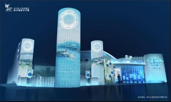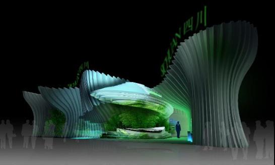 展館外立面是用多媒體構(gòu)成的川字造型立柱,立體展現(xiàn)飛躍的“太陽神鳥”標(biāo)識,分別表現(xiàn)四川的文化與水、生態(tài)與水、城市與水。與大山大水展墻相呼應(yīng)、連接二層的展示平臺,最大限度地合理利用頂面、地面與二層空間,強(qiáng)調(diào)氣勢與變化。整個展廳采用半通透式的展示結(jié)構(gòu),以體現(xiàn)四川人包容和開放的胸襟。