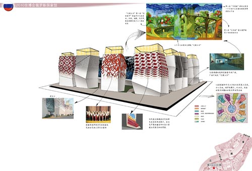 俄羅斯館占地6000平方米,是世博會(huì)最大的展館之一。它的外圍是12座不規(guī)則形狀的塔樓,聳立于草坪和水景之間,塑造出俄羅斯館傳統(tǒng)與現(xiàn)代相結(jié)合的外形。