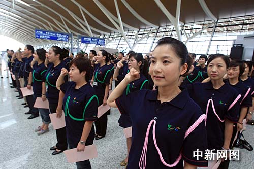 中新網(wǎng)上海9月4日電 (;萦ⅰ√K巍巍) 9月4日上午,上海機(jī)場(chǎng)集團(tuán)在浦東機(jī)場(chǎng)T2航站樓舉行了上海機(jī)場(chǎng)世博志愿者服務(wù)總隊(duì)成立儀式,120名身著統(tǒng)一服裝的志愿者代表在9名勞模的帶領(lǐng)下莊嚴(yán)宣誓,“我志愿成為一名光榮的上海機(jī)場(chǎng)世博志愿者。我承諾:盡已所能,不計(jì)報(bào)酬,幫助他人,服務(wù)社會(huì)!鄙虾C(jī)場(chǎng)集團(tuán)副總裁、上海機(jī)場(chǎng)世博志愿者服務(wù)總隊(duì)第一副總隊(duì)長(zhǎng)朱寧一向4支志愿者服務(wù)隊(duì)授牌。