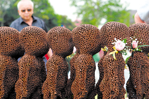 世博會建設(shè)留下的破銅爛鐵搖身一變,成了承載藝術(shù)家奇思妙想、宣傳節(jié)能環(huán)保的“精靈”。昨天(16日),2009年上海國際鋼雕藝術(shù)節(jié)拉開帷幕,來自世界各地近百具由廢棄金屬改造的雕塑奪人眼球。前擋板抹上“口紅”,輪胎和車身“穿”上彩色噴漆,報(bào)廢鏟車蛻變?yōu)椤澳Φ桥伞薄?table border=0 cellspacing=0 cellpadding=0 align=left>