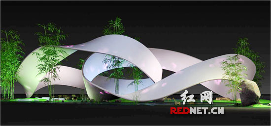 (三)彰顯湖湘文化,突出湖南元素。展館的設(shè)計形象湖南色彩濃厚,竹、紙、芙蓉花、桃花源、武陵源概念等湖南元素以及蔡倫造紙、隆平水稻、白石藝術(shù)、毛澤東故事等湖湘人文形象貫穿整個設(shè)計。環(huán)體主體材料為竹結(jié)構(gòu),且整個場館掩映于竹林碧水之間,竹使人聯(lián)想起湘妃竹、瀟湘竹海和毛主席的詩句。整個魔比思環(huán)就像展開的卷軸,環(huán)體外表用紙裝飾,紙是中國古代四大發(fā)明之一,湘人蔡倫造紙,體現(xiàn)了湖南歷來有重視教育科技創(chuàng)新的傳統(tǒng)。芙蓉花代表湖南自然、綠色形象。還有懷素的草書、齊白石和黃永玉的畫,體現(xiàn)出湖南人對自然的膜拜、對美的執(zhí)著追求。館名“桃花源里·Xanadu”更是顯現(xiàn)了桃花源的概念和世人對“世外桃源”的千年尋夢。并用這些濃厚的湖南元素設(shè)計組合,烘托出毛澤東詩句中的“萬類霜天競自由”、“桃花源里可耕田”、“芙蓉國里盡朝暉”的偉大浪漫主義情懷,把“都市桃花源”的理想境界推廣到全世界。