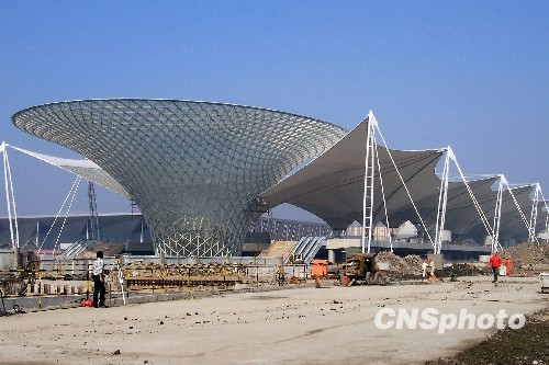 世博軸工程將于2009年底竣工。世博軸設(shè)計獨具匠心,既有引陽光入地下,減少照明能耗的巨大杯狀陽光谷,也有為參觀者遮陽擋雨、綿延輕透的世界最大索膜結(jié)構(gòu),這些鮮明特征使世博軸成為上海世博會的一大標志。世博軸是2010年上海世博會的主入口、中央安檢通道和人行立體交通、服務(wù)樞紐。圖為11月26日拍攝的藍天下的上海浦東世博園區(qū)的世博軸工地。中新社發(fā) 周東潮 攝