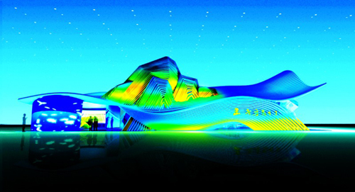 記者在現(xiàn)場(chǎng)看到,盡管尚需細(xì)化,但剛剛誕生的山東館已顯示出不凡魅力。展館占地600平方米,最高處約9米,以藍(lán)色為主色調(diào),突破了以往展館四墻合圍的方正常規(guī),外觀將大海的浪涌和雄峙的泰山融為一體,流暢的曲線勾勒出山東“海岱交融”的地理形勝,表達(dá)出“青山連綿不絕,綠水長流不斷”的文化意境。