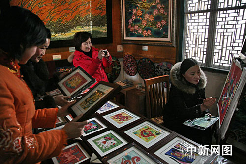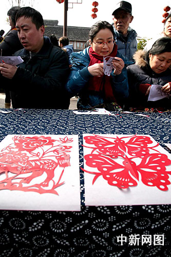 中新網(wǎng)上海2月18日電 在上海金山著名文化古鎮(zhèn)楓涇,一場(chǎng)由金山農(nóng)民畫家和游客共同參與的繪世博題材農(nóng)民畫、剪世博窗花PK賽,17日在位于該鎮(zhèn)中國農(nóng)民畫村和古戲臺(tái)舉行。