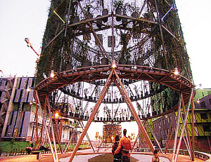 說起城市的標志性建筑,你的腦海中或許會閃現(xiàn)埃菲爾鐵塔、自由女神、悉尼歌劇院、東方明珠、迪拜塔……而對于西班牙馬德里來說,則是竹屋和“氣候樹”。竹屋原是政府提供給低收入人群居住的廉租屋,但它獨特的設計為居住者創(chuàng)造了一種“回歸自然”的原生態(tài)氛圍。“生態(tài)氣候樹”則是馬德里生態(tài)大道三座圓柱形鋼結構建筑之一。“樹”上安放了各種綠色植物,“樹”頂安裝有太陽能電池板。一到夜間,此處就成了音樂的天堂,白天儲存的電力完全可以滿足照明、音響的需要。在世博城市最佳實踐區(qū)北部街區(qū),設計師將把這兩個建筑的精髓呈現(xiàn)給參觀者。
