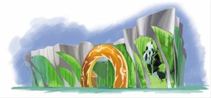 進(jìn)入拱門,參觀者將遇見歡迎八方來賓的大熊貓“歡歡”。通過多媒體播放,這位迎賓者傳遞出四川人民的熱情。 “歡歡”也是人們整個(gè)參觀過程中的導(dǎo)游,會(huì)在各個(gè)展區(qū)的多媒體視頻上出現(xiàn)。