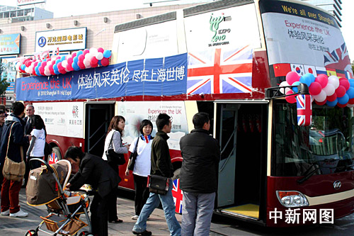 記者在現(xiàn)場(chǎng)看到,這輛雙層世博大巴上噴有英國(guó)館“蒲公英”圖案,紅藍(lán)白三色氣球以及“體驗(yàn)風(fēng)采英倫,盡在上海世博”的宣傳語,讓人一目了然。