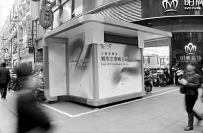 記者所見的這個“七彩之心”站亭,屬于外建站,地處徐匯區(qū)商業(yè)街“永新坊”,不過7平方米,主要材料為耐高溫、耐潮濕、耐風雨的彩鋼板。外形四四方方,看上去,與東方書報亭差不多大小,主色調(diào)為白色,四周邊沿則以七色裝飾,如彩帶縈繞。正面卷簾門板上,印著志愿者標志——七彩的志愿者之“心”,“上海世博會城市志愿服務站”幾個大字十分醒目。左、右兩側(cè)的門板上,同樣繪有世博會標志和志愿者標志,以及世博會志愿者口號:“世界在你眼前,我們在你身邊”。在站亭的正上方,有一條LED滾動顯示屏,滾動著“城市,讓生活更美好”等宣傳標語。