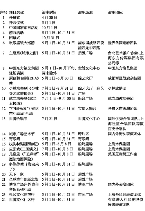 上海世博會(huì)期間,世界各地表演團(tuán)體將帶來(lái)2萬(wàn)多場(chǎng)文藝演出和活動(dòng)。由東道主組織的19項(xiàng)盛大演出也已準(zhǔn)備就緒,開(kāi)幕第一天起陸續(xù)在世博園全新的文化中心、綜藝大廳、綜藝廣場(chǎng)、后灘廣場(chǎng)、船臺(tái)廣場(chǎng)、寶鋼大舞臺(tái)、育樂(lè)灣、船塢劇場(chǎng)、博覽廣場(chǎng)、市民廣場(chǎng)一一亮相,生動(dòng)演繹各國(guó)傳統(tǒng)和文化,盛情邀請(qǐng)各國(guó)來(lái)賓分享和互動(dòng)——