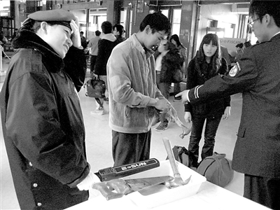 “根據(jù)現(xiàn)在的規(guī)定,您攜帶的錘子不得攜帶進站上車!币幻丝驮跀y帶著錘子等工具通過安檢儀后,被安檢人員攔下。據(jù)安檢人員介紹,現(xiàn)在的安檢力度基本和奧運期間持平,像剪刀、大型水果刀等物品都是不允許攜帶上車的。旅客被查獲的物品,可暫時保存在進站口由其朋友領(lǐng)走,或直接辦理托運。