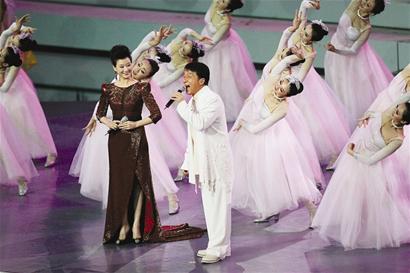 約半個小時的開幕式演出,聚合了五大洲的頂級明星,星光璀璨照耀浦江。在嘉賓入場后,由上海大學(xué)生組成的800人合唱團(tuán)唱起一曲《和諧歡歌》,“鮮花簇?fù)砑s定地方,熟悉沒見過的臉龐,呼喚聽見心靈激蕩,邀世界分享……”著名歌唱家宋祖英和國際巨星成龍攜手出場,為本次世博會開幕唱響第一個強(qiáng)音。