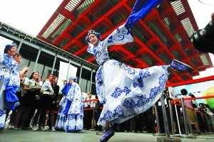 上午10時(shí),隨著“北京歡迎你”歌聲的響起,北京周慶典廣場第一場文藝演出開始。白色的天壇是背景,舞臺上紅衣少女隨著鼓點(diǎn)在舞動(dòng),鼓點(diǎn)聲從廣場中心向四周傳開,傳向世博軸,傳向中國館。