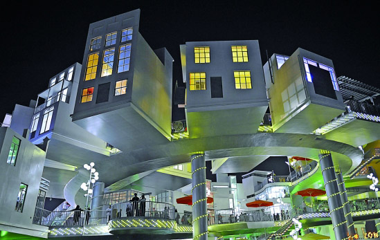 很多場館在設計時,就考慮了夜間效果,用燈光展示場館的另一面。浦東園區(qū)“燈光秀”的主打陣地是“一軸四館”。要欣賞夜景,首選地是世博文化中心:白天,它是潔白的巨型飛碟;夜晚,它變身神秘的“浮游都市”。