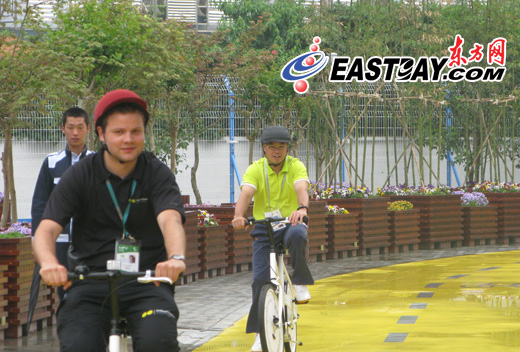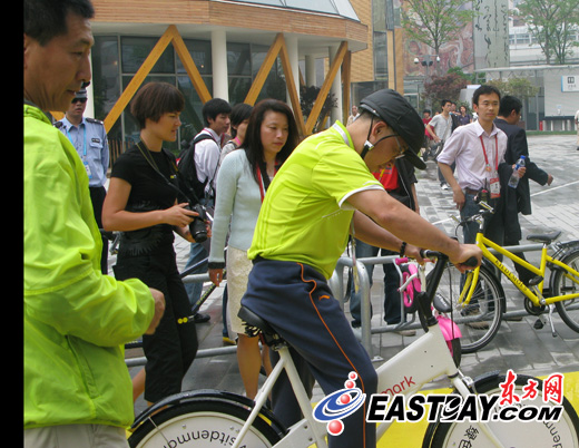 黃綠色的李寧運(yùn)動(dòng)短T,深色的李寧網(wǎng)球褲,白色的李寧運(yùn)動(dòng)鞋,再加一頂黑色的李寧鴨舌帽,今天上午10點(diǎn)半左右,在各路記者的簇?fù)硐,昔日體操王子李寧出現(xiàn)在世博會(huì)浦西城市最佳實(shí)踐區(qū),從馬德里案例區(qū)出來(lái)后,出現(xiàn)在了歐登塞展區(qū),看著路邊停放著的一整排自行車,李寧也過(guò)了一把騎車癮,引起了游客的圍觀。
