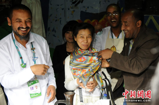 非洲聯(lián)合館管理部部長陳錦田為張根囡配帶上限量版的榮譽(yù)徽章,并向她贈送非洲聯(lián)合館出版的《非常非洲》、《非洲故事》兩本書的首冊。埃塞俄比亞參展總代表Sisay Getachew還邀請她到埃塞俄比亞展區(qū)品嘗咖啡,并親自為其佩戴當(dāng)?shù)貒怼?/p>