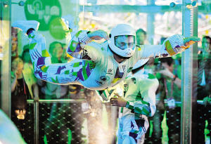 在展館樓上,有一個(gè)8米高的“玻璃房子”,一鼓風(fēng),玻璃房?jī)?nèi)的人可以飛起來(lái),風(fēng)洞的風(fēng)速可以在瞬間達(dá)到20公里/小時(shí),穩(wěn)穩(wěn)托舉住“飛人”。在昨天開館儀式后,拉脫維亞總理東布羅夫斯基斯身穿“飛翔服”,戴上頭盔,親身體驗(yàn)了一回當(dāng)空中飛人的感覺,將現(xiàn)場(chǎng)氣氛推向高潮。