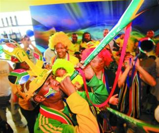 雖然開幕式要到20∶00才開始,但在19∶00不到的時(shí)候,南非館的門口和館內(nèi)就已經(jīng)喧鬧無(wú)比,受邀參加南非館世界杯開幕慶典的嘉賓,幾乎人手一個(gè)VUVUZELA,頭戴“馬卡若卡”(一種南非特色帽子,外觀像足球)。南非球迷的脖子上還掛著印有南非國(guó)旗的圍巾,臉上或手臂上也彩繪著南非國(guó)旗。