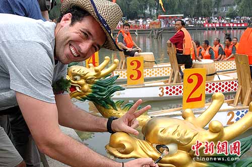 隨著裁判的一聲令下,龍舟賽開賽,現(xiàn)場陣陣歡呼加油聲。第一次到中國,看到這種比賽,Tomas好奇地頻頻按下快門。一邊看著15支隊伍的激烈爭奪競,一邊詢問著記者關(guān)于這項中國傳統(tǒng)民俗的由來和剛剛給龍“點睛”的典故,聽完記者的解釋后,Tomas贊嘆不斷:“太有意思了!”