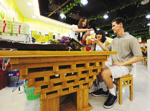 茶文化園內(nèi)20個展臺前,均設(shè)有供賓客免費品茗、觀賞中華茶藝的休閑區(qū),客人們在此休憩、品茗的同時,也被繽紛多彩、香味濃郁的各色中華名茶深深吸引,許多人往往會情不自禁地掏錢買幾份包裝考究、有世博會標(biāo)識圖案的禮品茶饋贈給親友。比利時籍華人游客翁先生是食品采購商,他逐一品嘗了味道不一的帝芙特伯爵紅茶、薄荷茶、芙蓉茶、綠怡茶,對這些印有海寶和各國展館圖案的金字塔形茶葉包裝盒很感興趣,認為很有藝術(shù)感,要帶到比利時,讓大家品嘗一番中國佳茗,為此他一下子就訂購了3500份這種造型的禮品茶。據(jù)悉,光顧茶文化園的賓客中,近30%來自美國、加拿大、德國、新加坡、日本、韓國、尼泊爾等國家,世博茶文化園已成為外國賓客了解中國茶文化的一個窗口。(江躍中 顧武)