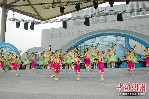 中新網(wǎng)上海6月27日電(趙龍)行云流水的古箏、歡快奔放的二胡、委婉鏗鏘的琵琶……今日伴著淅淅瀝瀝的雨聲,百余名蘇州少年帶來的“琴瑟滄浪”民樂演奏音樂會,在世博園全球城市廣場奏響,讓中外觀眾領略了一把中國傳統(tǒng)民樂的魅力。