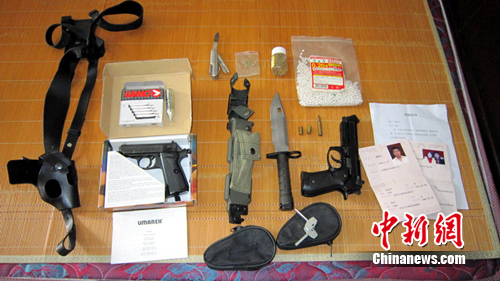 7月9日上午,義烏市公安局刑偵大隊(duì)技術(shù)員前往犯罪嫌疑人胡益華在金華的住處進(jìn)行進(jìn)一步調(diào)查時,從該處搜出仿真槍兩支、軍用子彈一顆、彈殼兩枚、銅子彈及塑料子彈若干、軍用匕首一把、槍套一副、手銬鑰匙兩個等違禁物品。