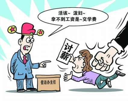 27日,因東莞市東城區(qū)“藏寶國際大酒店”拖欠裝修工人工資,工人拉橫幅上街討薪,兩工人被不明身份的黑衣人毆打。28日,東城區(qū)政府信訪辦就此舉行協(xié)調(diào)會,會上工人提及被打一事,主持會議的信訪辦主任葉柱權(quán)說是“活該”,他情緒激動,拍桌子罵女工人為“潑婦”,稱工人拿不到工資是“交學費”。(相關(guān)報道見今日A14版)