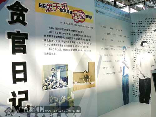 展廳中引人矚目的,是曾“名噪一時”的自治區(qū)煙草專賣局原銷售處處長、來賓市煙草專賣局原局長韓峰!叭沼浘珠L”也進入展覽,引來眾人圍觀。